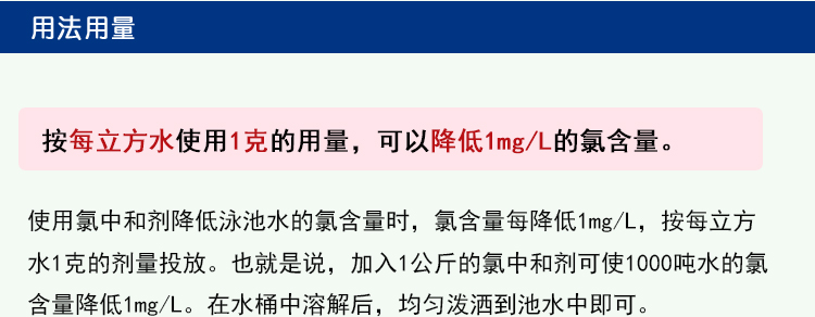 2、按每立方水1克的用量,可以降低1mg/L的氯含量。