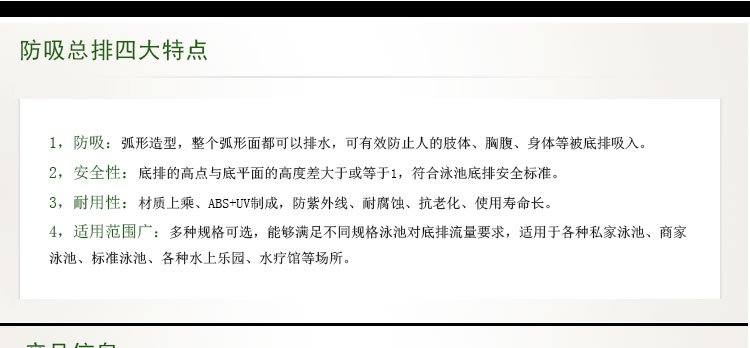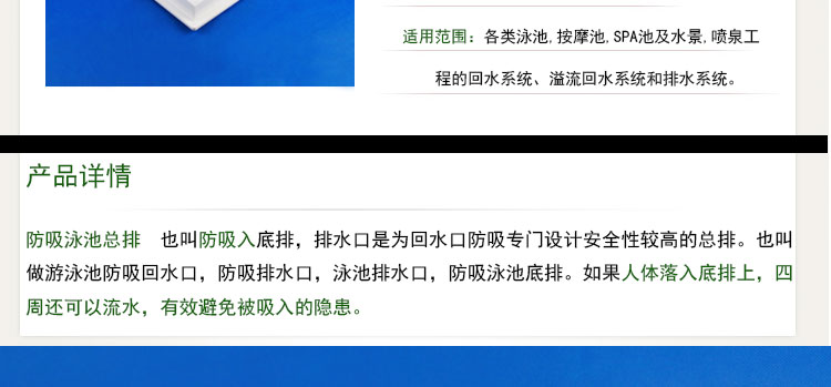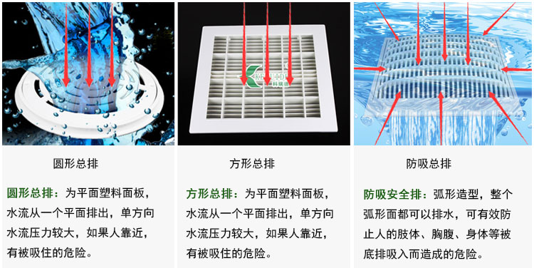 防吸排水口,是可以防吸。也叫做游泳池防吸入底排口,防吸回水口,防吸總排,泳池排水口,防吸泳池底排。如果人體落入底排上,四周還可以流水,人則有效避免不會被吸入的隱患。