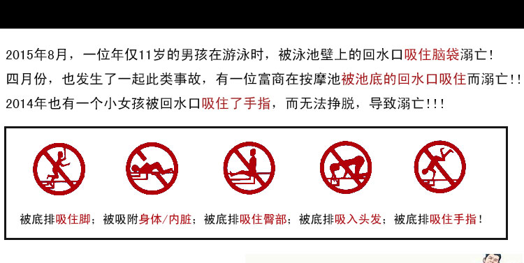 吸卡肢體的危險:因手指等肢體被底排吸卡,并導致無法拔出。