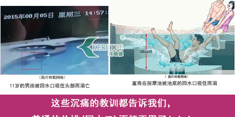 目前,已經(jīng)發(fā)生過好幾起泳客被泳池底部的排水口吸住溺亡的事故,因此解除排水口安全隱患迫在眉睫。游泳池采用防吸回水口已經(jīng)是一個趨勢,建議每一家游泳館都及時更換排水口,避免事故發(fā)生!