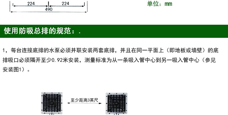 1,每臺連接底排的水泵必須并聯(lián)安裝兩套底排,并且在同一平面上(即地板或墻壁)的底排吸口必須隔開至少0.92米安裝,測量標準為從一條吸入管中心到另一吸入管中心。