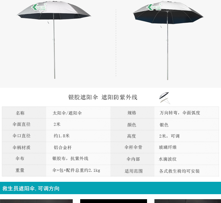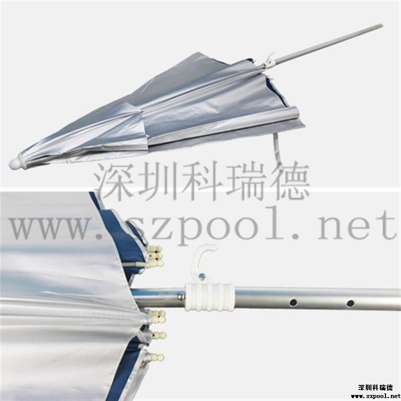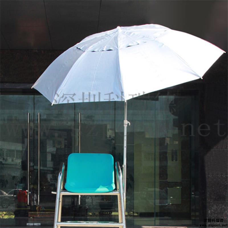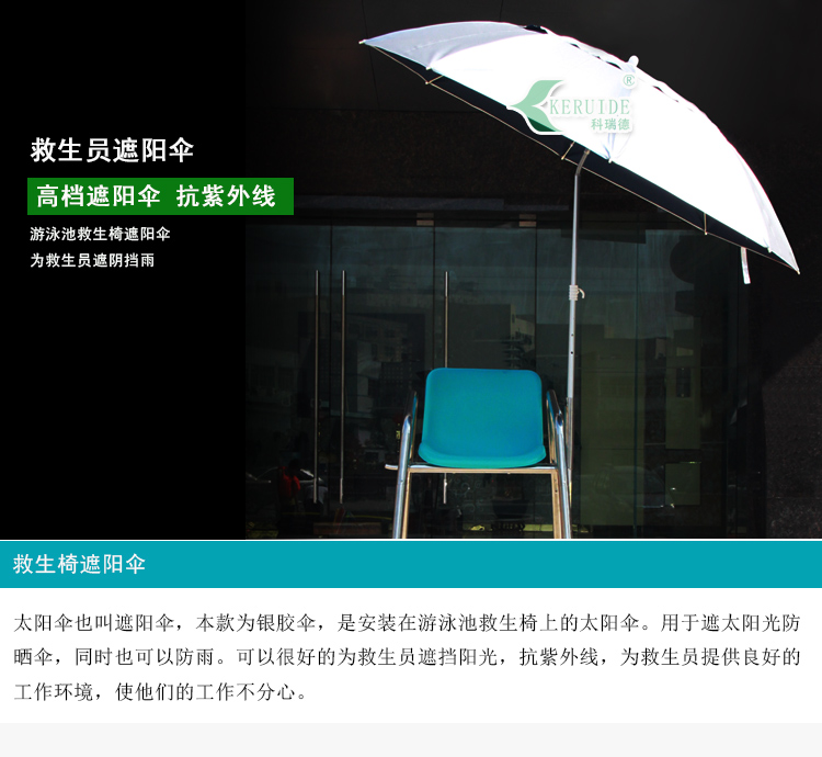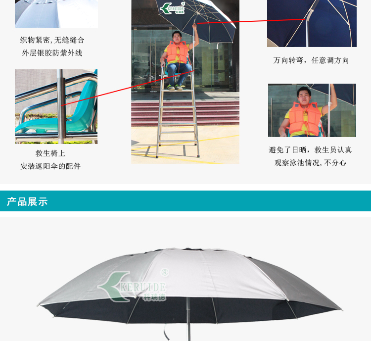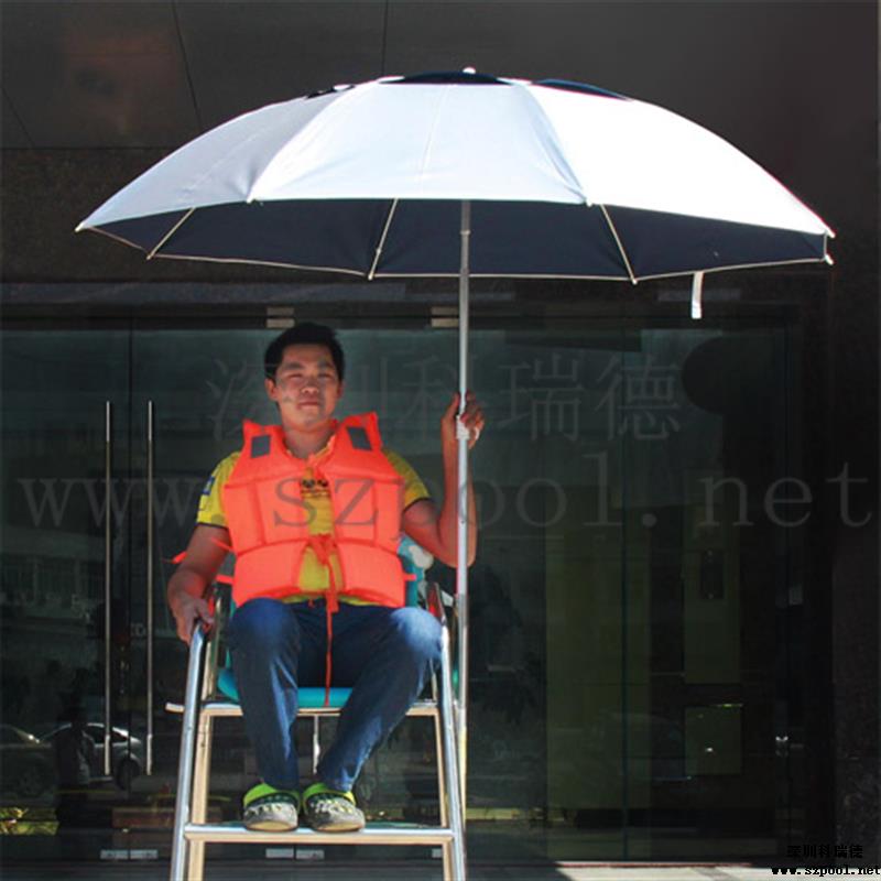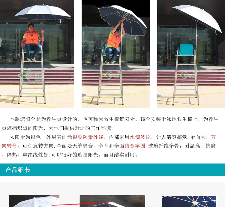 救生員遮陽傘也叫救生椅太陽傘,是安裝在游泳池救生椅上,為救生員遮擋陽光的傘,同時也可以防雨。本款太陽傘采用210D滌絲銀膠布,拒水pu涂層可防雨。外部的銀膠涂層可效抵擋陽光中的紫外線,內(nèi)部采用水滴波紋,為深色,可以避免地面反射的UVA至臉部。而且傘面積大,為萬向傘,可以任意角度調(diào)節(jié)。傘柄的高度也可以調(diào)整。