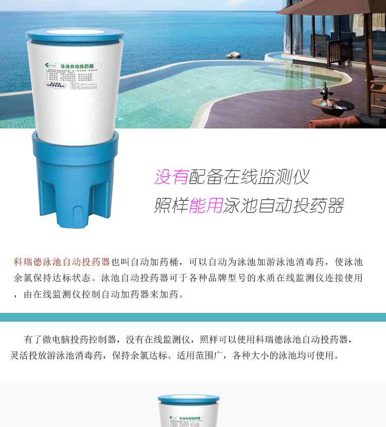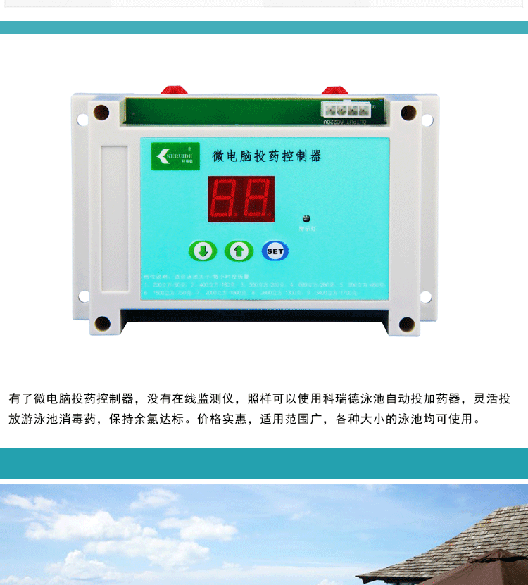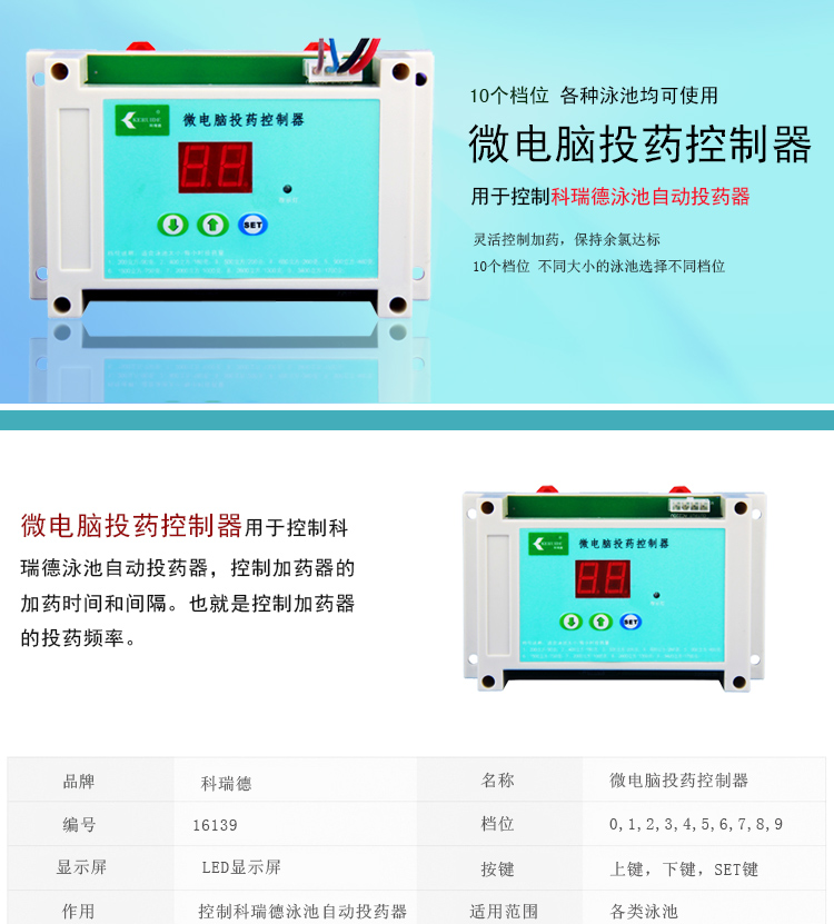 科瑞德微電腦投藥控制器可控制投放泳池消毒劑,也可控制投放泳池pH調(diào)節(jié)劑,一個控制器控制投放一種藥劑。