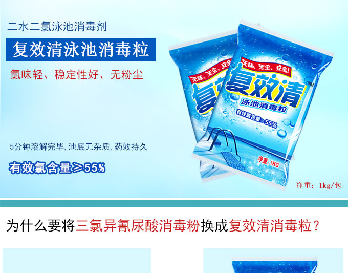 復(fù)效清泳池消毒粒,屬于游泳池消毒劑的一種:有效氯含量≥55%,其特點(diǎn)是:氯味輕——穩(wěn)定性好!無(wú)粉塵——不用擔(dān)心吸入鼻孔!pH中性——不會(huì)導(dǎo)致池水PH下降!溶解性好——池底不會(huì)有雜質(zhì)!