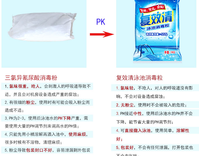 復(fù)效清泳池消毒粒帶有輕微的氯味,相對(duì)于三氯異氰尿酸消毒劑來(lái)說,不會(huì)刺激呼吸道和眼睛,讓人使用時(shí)沒有任何心理壓力,環(huán)保高效,且余氯保持時(shí)間能持續(xù)更久,另外產(chǎn)品PH值偏中性,使用后對(duì)水質(zhì)的PH值影響不大,事后可以節(jié)省很多ph調(diào)節(jié)劑(三氯系列消毒劑ph偏低,用后往往需要使用ph調(diào)節(jié)劑來(lái)調(diào)劑ph值)。