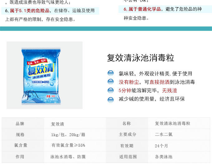 復(fù)效清泳池消毒粒是一種較為安全的游泳池消毒劑,屬于普通化學(xué)品,避免了在運(yùn)輸、儲(chǔ)存及使用過程中的種種安全隱患!是三氯等?;愊緞┑睦硐胩娲罚?/span>