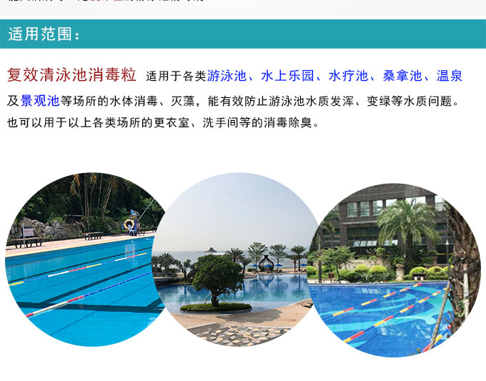 在大家日益注重游泳池衛(wèi)生健康與安全的今天,復(fù)效清泳池消毒粒,其氯味輕、無(wú)粉塵、pH中性、溶解性好等這些優(yōu)秀的特點(diǎn)使得它越來(lái)越受市場(chǎng)的歡迎,不管是室內(nèi)池還是室外池都同樣適合使用,讓其逐漸地成為了游泳池常用的消毒用品。