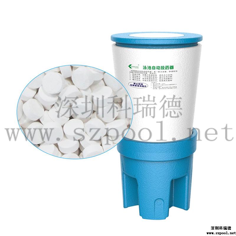3、將復(fù)效凈泳池消毒片加入科瑞德泳池自動(dòng)投藥器進(jìn)行自動(dòng)投加,其加入量由監(jiān)測(cè)儀進(jìn)行控制,這是一種智能的自動(dòng)加藥模式,能夠節(jié)省人工、物力及藥劑等,并且密封性好,避免了氯氣泄漏造成的腐蝕機(jī)房設(shè)備及對(duì)人體健康造成不良后果,不管是從精力、健康、成本、水質(zhì)智能化維護(hù)角度甚至是衛(wèi)生監(jiān)督局抽查角度看,這都是一種較好的自動(dòng)加藥模式。