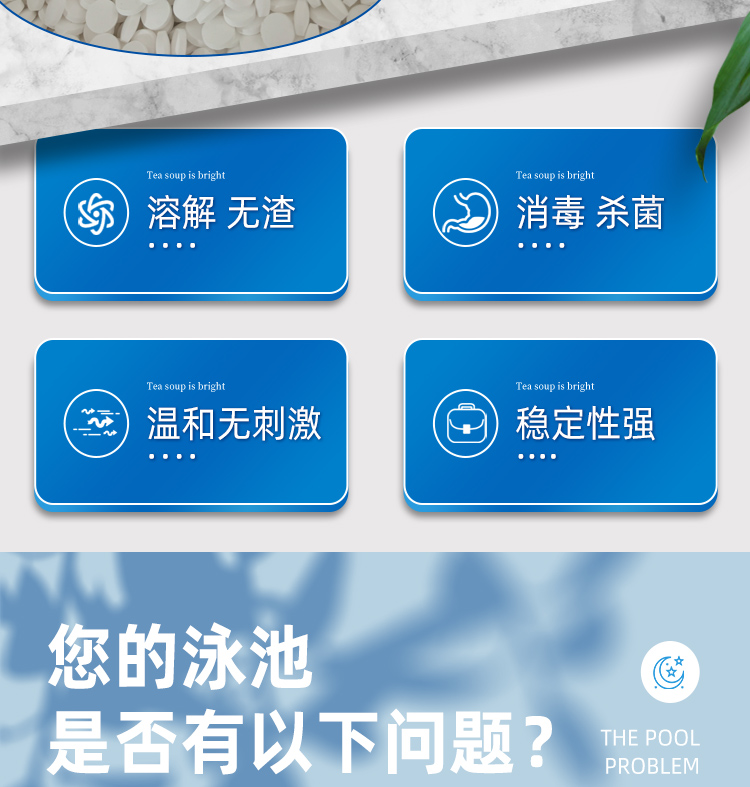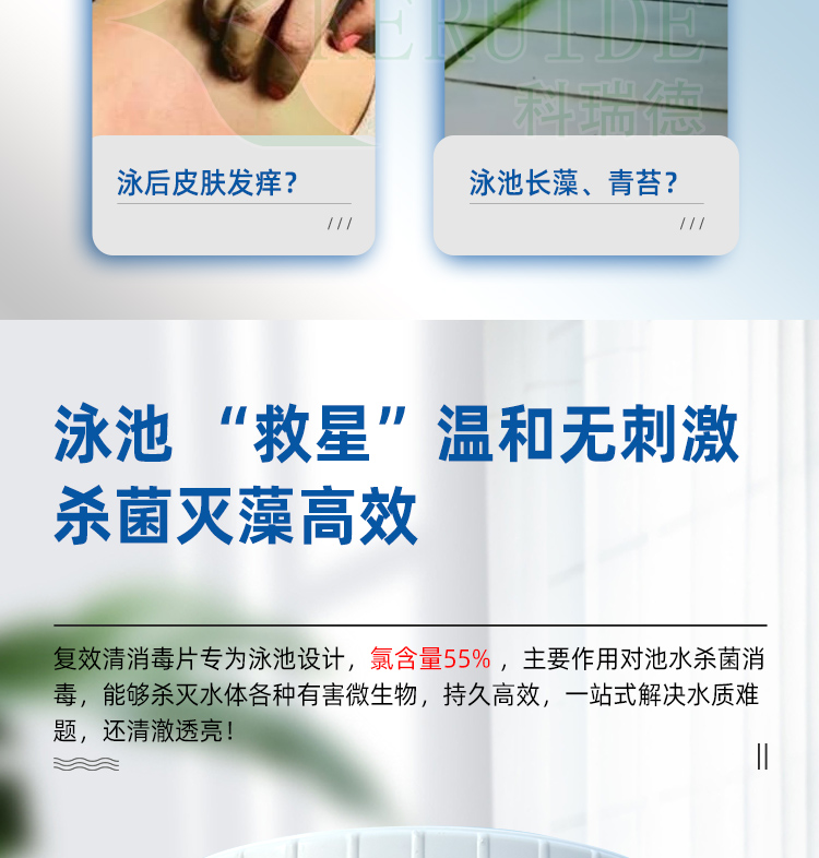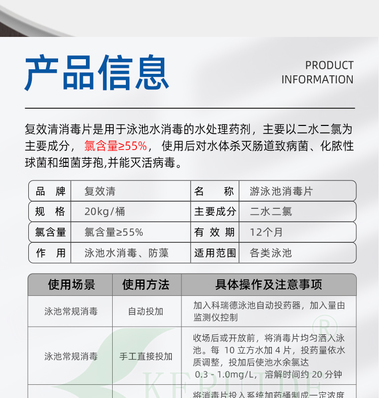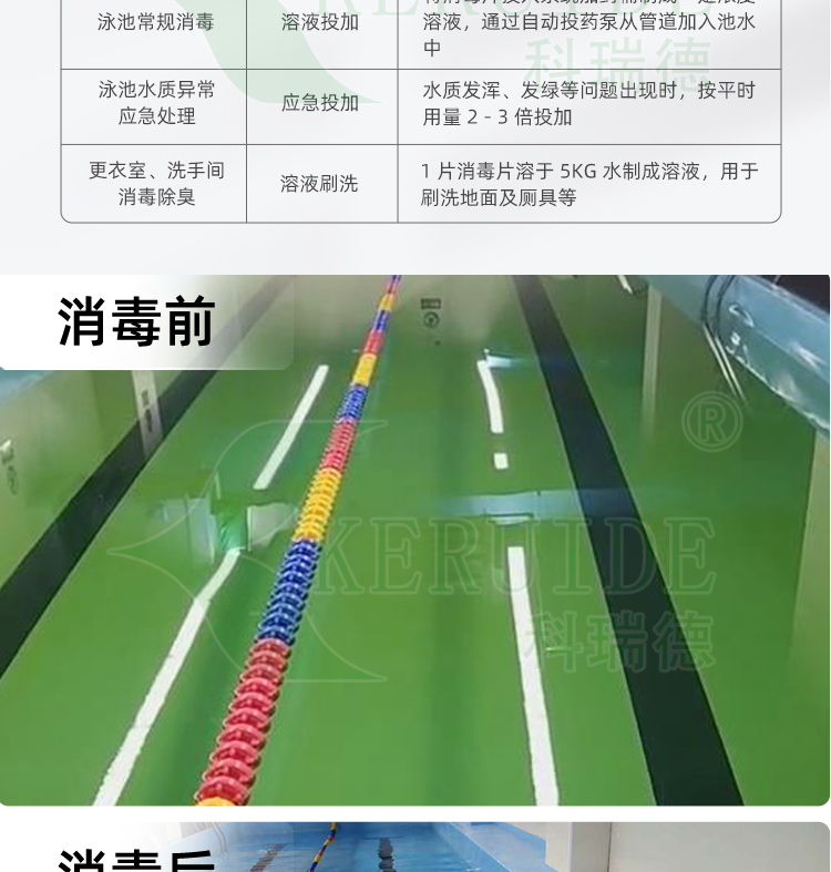 使用范圍:復(fù)效清泳池消毒片適用于各類(lèi)游泳池、水上樂(lè)園、水療池、桑拿池、溫泉及景觀池等場(chǎng)所的水體消毒、滅藻,能有效防止游泳池水質(zhì)發(fā)渾、變綠等水質(zhì)問(wèn)題。也可以用于以上各類(lèi)場(chǎng)所的更衣室、洗手間等的消毒除臭。