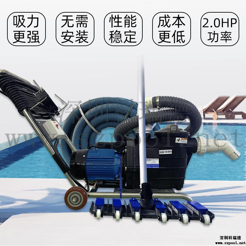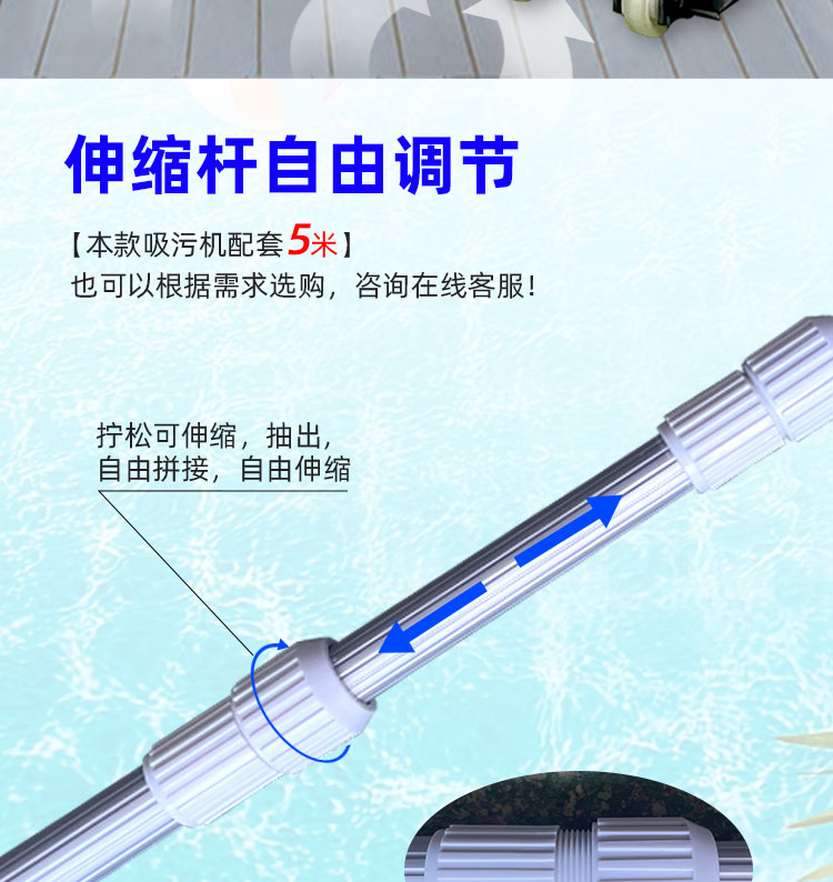 ④用伸縮桿把吸污頭推到池底,吸污機(jī)放在岸上,人無(wú)需下水;