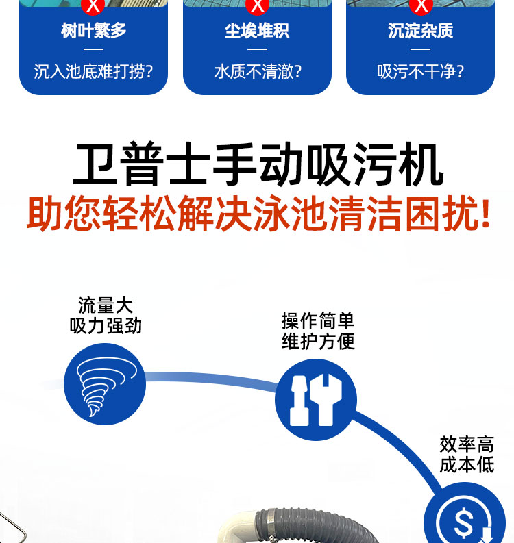 為什么推薦選擇我們的衛(wèi)普士3012手動(dòng)吸污機(jī)?衛(wèi)普士3012游泳池手動(dòng)吸污機(jī)配備19寸加重加厚吸污頭,避免吸污上浮,讓您站在岸邊就能輕松吸污!