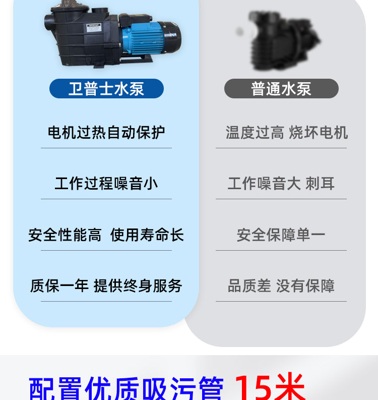 除了配備的吸污頭及電纜線優(yōu)于與市場(chǎng)上大部分手動(dòng)吸污機(jī),本款吸污機(jī)的吸污管也同樣配備的是優(yōu)質(zhì)雙色雙層自浮加厚吸污管,10米一節(jié),一個(gè)吸污機(jī)配備3節(jié)吸污管共30米長(zhǎng)。此吸污管耐磨、耐壓、硬度高、不易變形,性價(jià)比高。便于大家收到貨后使用以及運(yùn)輸安全,本款吸污泵在發(fā)貨前我們就已將水泵安裝專用的小車上,排污管也已裝在吸污泵上,各位收到貨后,按照以下圖片指示安裝即可使用。