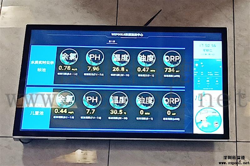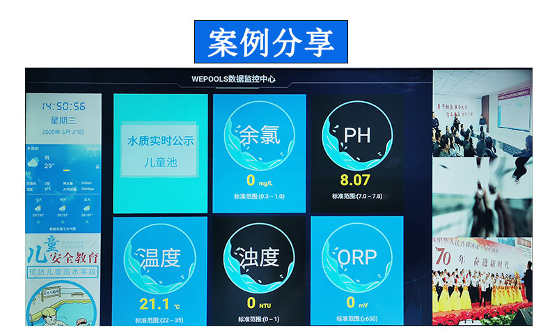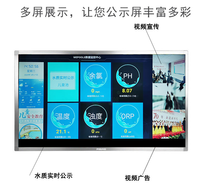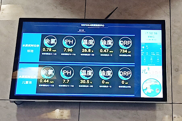 衛(wèi)普士水質(zhì)實時公示屏的設(shè)計理念是為解決目前泳池手寫水質(zhì)數(shù)據(jù)公示的落后方式而研發(fā)的。其水質(zhì)數(shù)據(jù)是通過在線監(jiān)測儀監(jiān)測到的水質(zhì)情況傳送過來公示的,數(shù)據(jù)是實時、動態(tài)以及真實的。并且衛(wèi)普士實時公示屏還可以分屏設(shè)置,給公眾展示游泳場館的各類設(shè)施及宣傳,達到一屏多用的效果。