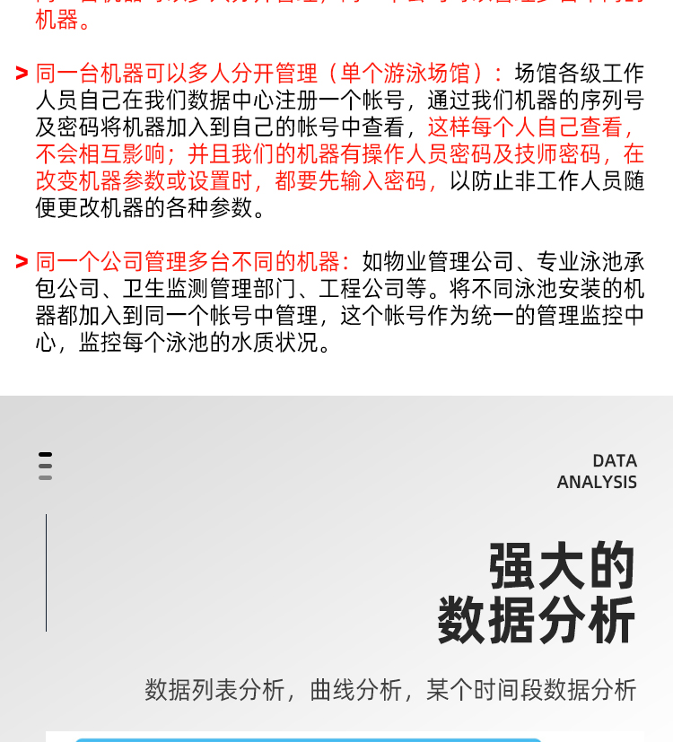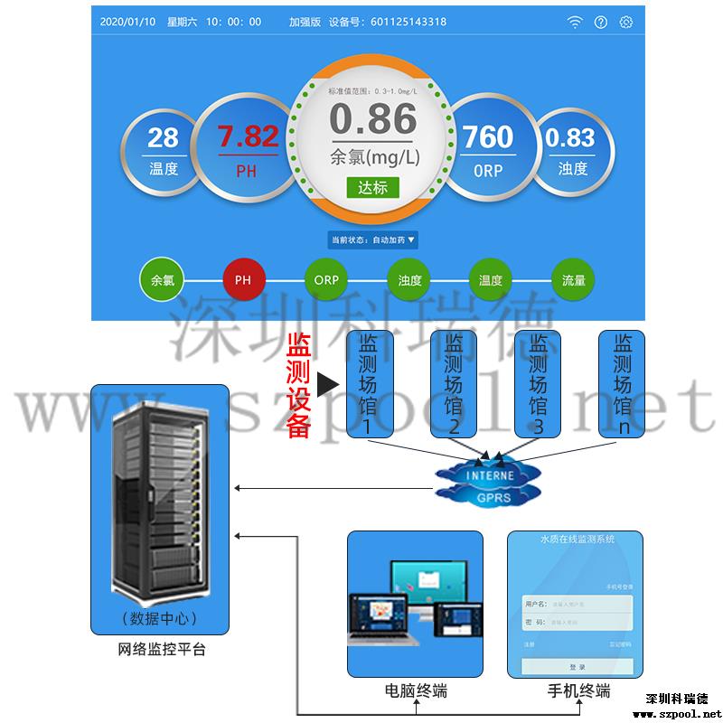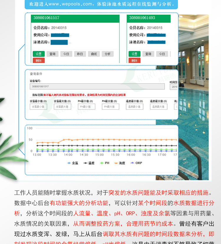 本W(wǎng)EPOOLS衛(wèi)普士水質在線監(jiān)測系統(tǒng)基于互聯(lián)網(wǎng)與移動互聯(lián)網(wǎng)技術,解決方案實現(xiàn)了城市區(qū)域內(nèi)各個游泳場館水質的遠程在線監(jiān)測,包括了數(shù)據(jù)自動采集、無線傳輸、云端儲存及分析處理、預警、投藥等功能的水質遠程在線監(jiān)控系統(tǒng)。
