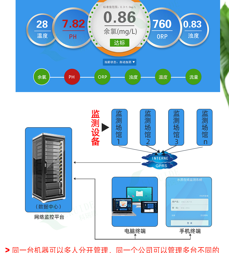 該設備CP808-B5可監(jiān)測:余氯、pH、溫度、ORP、濁度 五大參數(shù);CP808-B3可監(jiān)測余氯/pH/溫度;CP808-B3-2可監(jiān)測ORP/pH/溫度