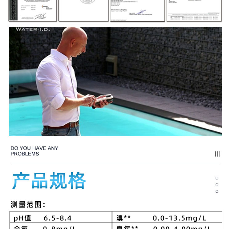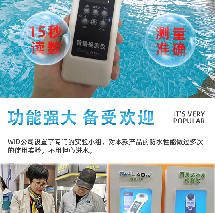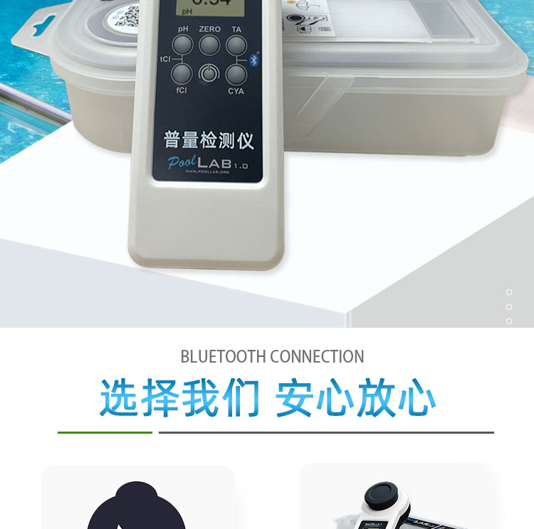 PoolLAB/普量水質(zhì)檢測儀是用于各類游泳池水質(zhì)檢測使用的儀器,它能檢測池水中:余氯/pH/氰尿酸/總堿度/結(jié)合性余氯/鈣硬度等13個(gè)項(xiàng)目指標(biāo),能快速檢測,得出結(jié)果,使用簡單、易懂、性能可靠等特點(diǎn),本款游泳池水質(zhì)檢測儀擁有IP68防水級(jí)別,在使用的過程不慎掉入水中或涉水不用擔(dān)心進(jìn)水,使用壽命長且經(jīng)濟(jì)實(shí)惠,應(yīng)對(duì)國標(biāo)GB37488-2019水質(zhì)項(xiàng)目檢測,每個(gè)游泳場所適合選擇。