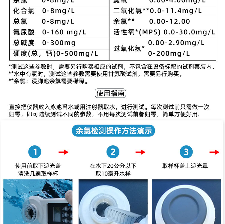 4. 如需測池水中的:余氯/氰尿酸,可以先加入余氯試劑,用碾棒碾碎溶解均勻,無殘留,蓋上遮光罩,按“fcl”鍵,等待15s,顯示測試結(jié)果后,清洗取樣槽,再次取水樣,加入氰尿酸試劑,碾碎溶解均勻,按“CYA”鍵,等待15s,顯示測試結(jié)果。(如果還想連續(xù)測試其它的指標(biāo),清洗取樣槽,重新取水樣,加入想測的試劑即可檢測了)以此類推!