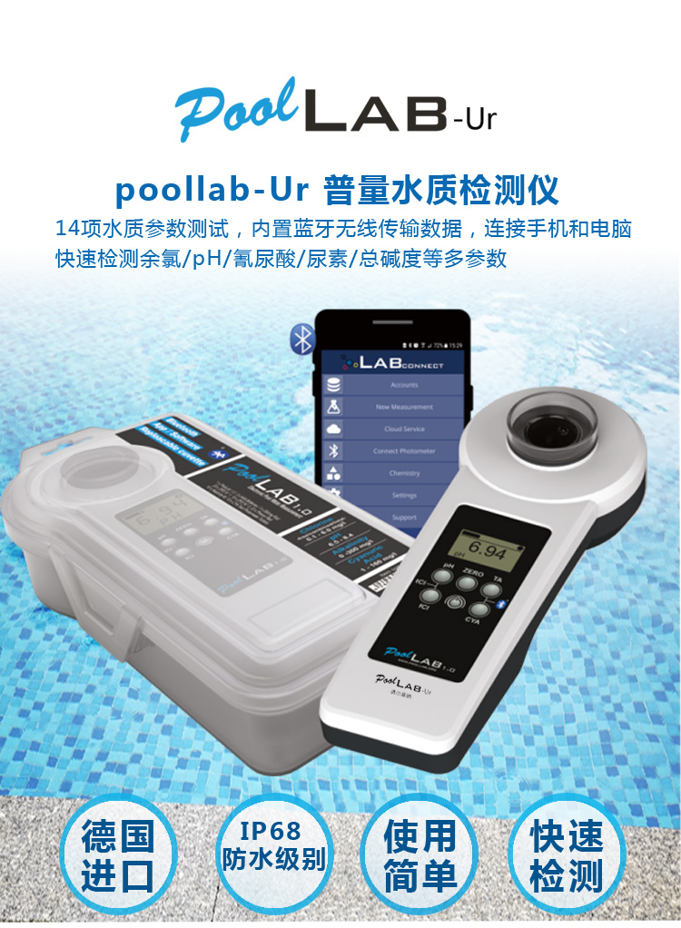 PoolLAB-Ur普量水質(zhì)檢測儀,是由德國進(jìn)口的水質(zhì)檢測儀,也叫現(xiàn)場快速檢測儀,游泳池水質(zhì)檢測儀,余氯pH檢測儀,多參數(shù)水質(zhì)檢測儀、尿素測試儀等多種叫法。