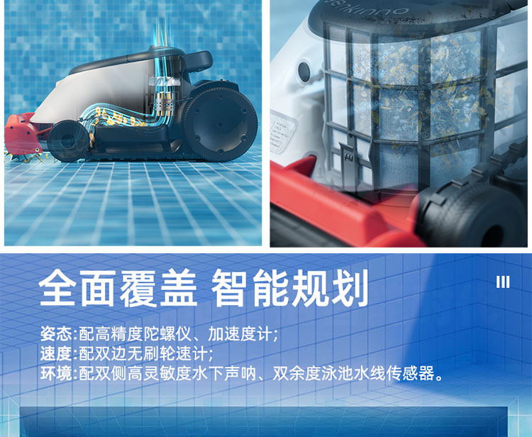 3D地形,像掃地機(jī)器人般弓形走位,可自主規(guī)劃路徑,精準(zhǔn)覆蓋池底、池壁及水線。無線充電設(shè)計(jì),