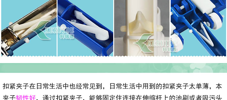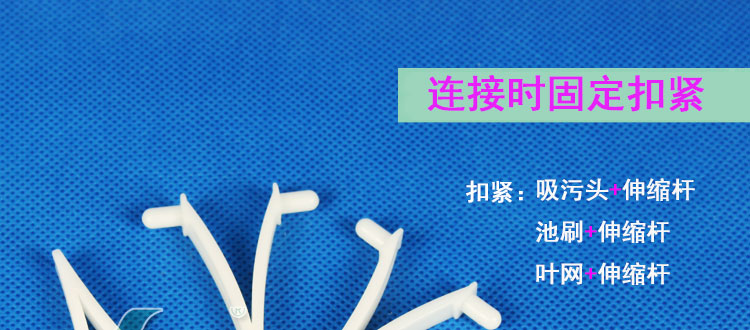 扣緊夾子在日常生活中也經(jīng)常見(jiàn)到,日常生活中用到的扣緊夾子太單薄,本款?yuàn)A子韌性好,通過(guò)扣緊夾子,能夠固定住連接在伸縮桿上的池刷或者吸污頭。并且,卸下來(lái)也方便。
