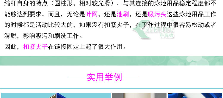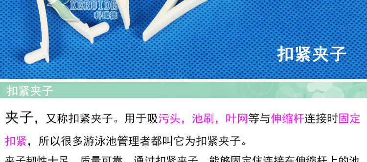扣緊夾子的用處非常多,只要用到伸縮桿的地方都有它的身影,所以,建議泳池工作者多買點(diǎn)以備用。