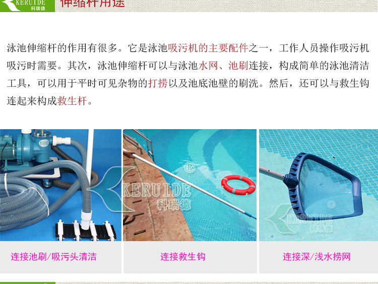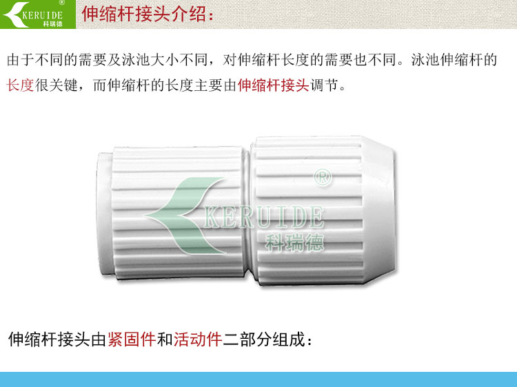 本款產(chǎn)品為伸縮桿接頭,旋轉(zhuǎn)鎖扣,主要用于調(diào)節(jié)伸縮桿的伸縮長度,一般伸縮桿長度有:5米和8米比較常用,伸縮桿可搭配:吸污機(jī)吸污頭、清潔刷、深/淺水網(wǎng)、救生鉤連接使用,而伸縮桿接頭是伸縮桿重要的配件,當(dāng)我們不需要伸縮桿這么長時可旋轉(zhuǎn)接頭調(diào)節(jié)長度。