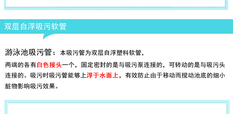 雙層管,夠硬度,耐壓耐用,不會(huì)被吸扁;能自浮于水面容易移動(dòng),并且不會(huì)攪動(dòng)池底的臟物而影響吸污效果。
