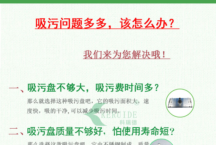 1,吸污盤的規(guī)格比一般的吸污頭大一倍左右,并且有四個吸污進水口,所配的水泵也相應較大,因此加快吸污的時間