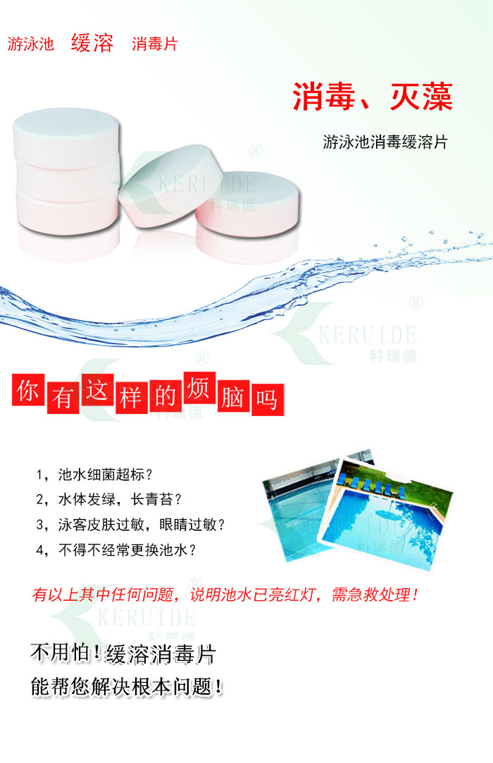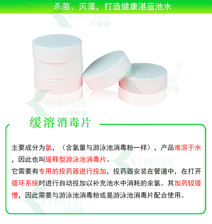 科瑞德緩溶消毒片:是以氯為主要成份的緩溶消毒片,量大可以滅藻,固稱為雙功能消毒片.用于游泳池水體消毒和滅藻,也叫游泳池消毒片。是常用游泳池水處理藥劑。