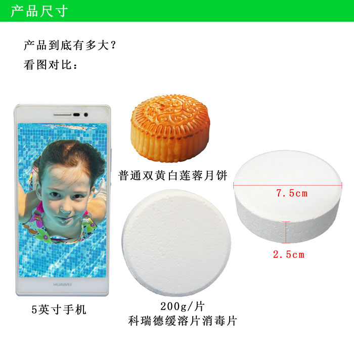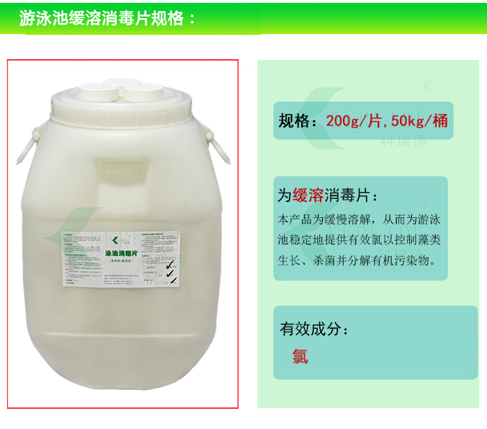 【包裝規(guī)格】:200g/片,50kg/桶。為緩溶消毒片。(因?yàn)樗幤容^大,也叫大片游泳池消毒片)