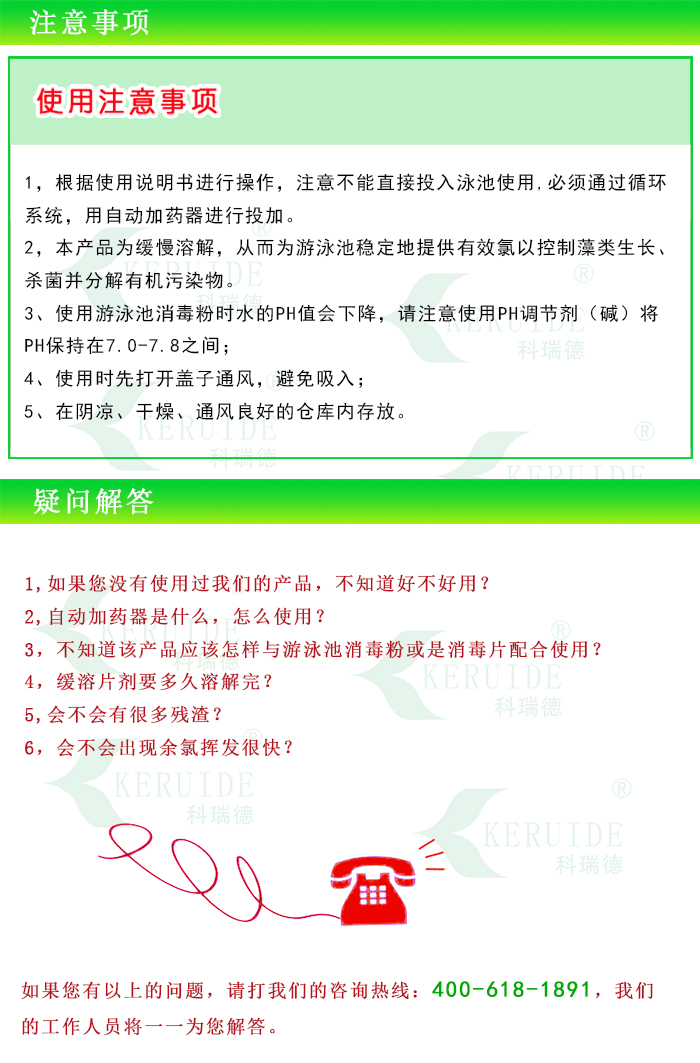 【使用方法】:緩溶消毒片不能直接投入泳池使用,必須使用自動(dòng)加藥器通過循環(huán)系統(tǒng)加入。如沒有自動(dòng)監(jiān)控系統(tǒng)控制加藥,則需人工檢測(cè)水的余氯,如低于標(biāo)準(zhǔn)則打開投藥器,如高于標(biāo)準(zhǔn)則關(guān)閉投藥器。