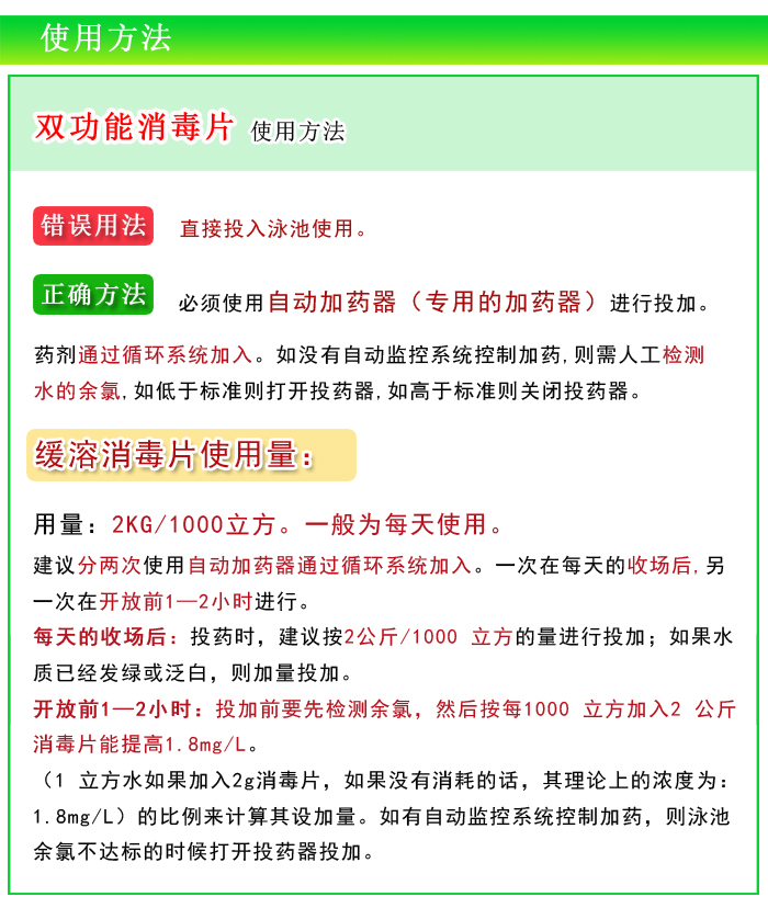 游泳池緩溶消毒片一般為每天使用,分兩次使用自動(dòng)加藥器通過循環(huán)系統(tǒng)加入,一次在每天的收?qǐng)龊螅端帟r(shí),按2 公斤/1000 立方的量進(jìn)行投加;如果水質(zhì)已經(jīng)發(fā)綠或泛白,則要加量投加。另一次在開放前1—2小時(shí)進(jìn)行。緩溶消毒片投加前要先檢測(cè)余氯,然后按每1000 立方加入2 公斤消毒片能提高1.8mg/L (1 立方水如果加入2g三氯消毒片,如果沒有消耗的話,其理論上的濃度為:1.8mg/L)的比例來計(jì)算其設(shè)加量。如有自動(dòng)監(jiān)控系統(tǒng)控制加藥,則泳池余氯不達(dá)標(biāo)的時(shí)候打開投藥器投加。