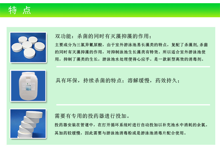 【特點(diǎn)】:緩溶消毒片主要成分為氯,具有消毒殺菌的作用,并且持續(xù)殺菌,殺菌的同時(shí)可滅藻抑藻,對(duì)抑制泳池生長藻類有特效。游泳池消毒和滅藻雙效合一,不喜歡每天投加游泳池水處理藥劑的私家泳池可以選擇使用此款,用加藥器自動(dòng)投加,省時(shí)省力。