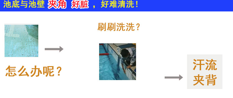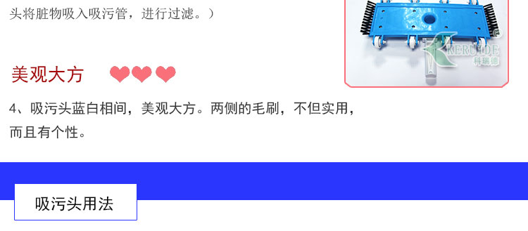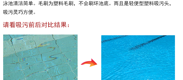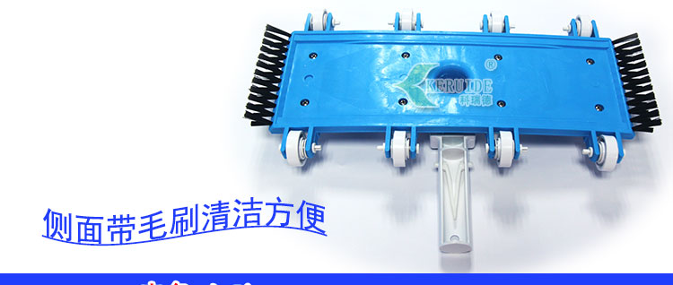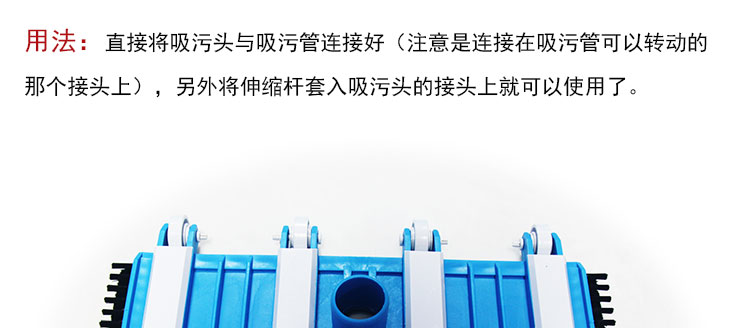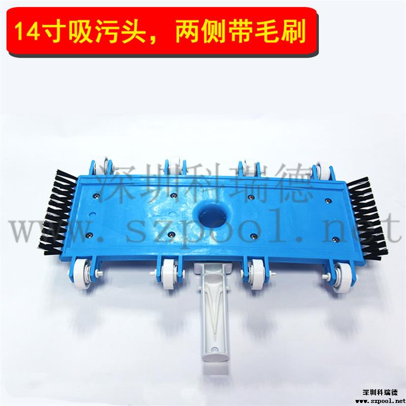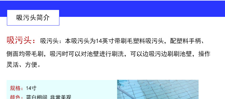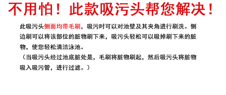 吸污頭:本吸污頭為14英寸帶刷毛塑料吸污頭,配塑料手柄、側(cè)面均帶毛刷,吸污時(shí)還可以對(duì)池底進(jìn)行刷洗,可以邊吸污邊刷洗池底,操作靈活、方便。