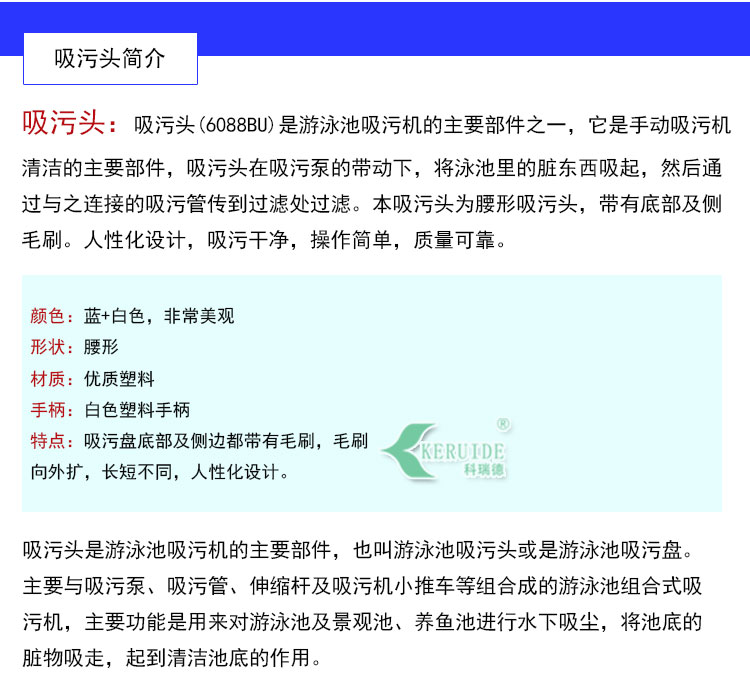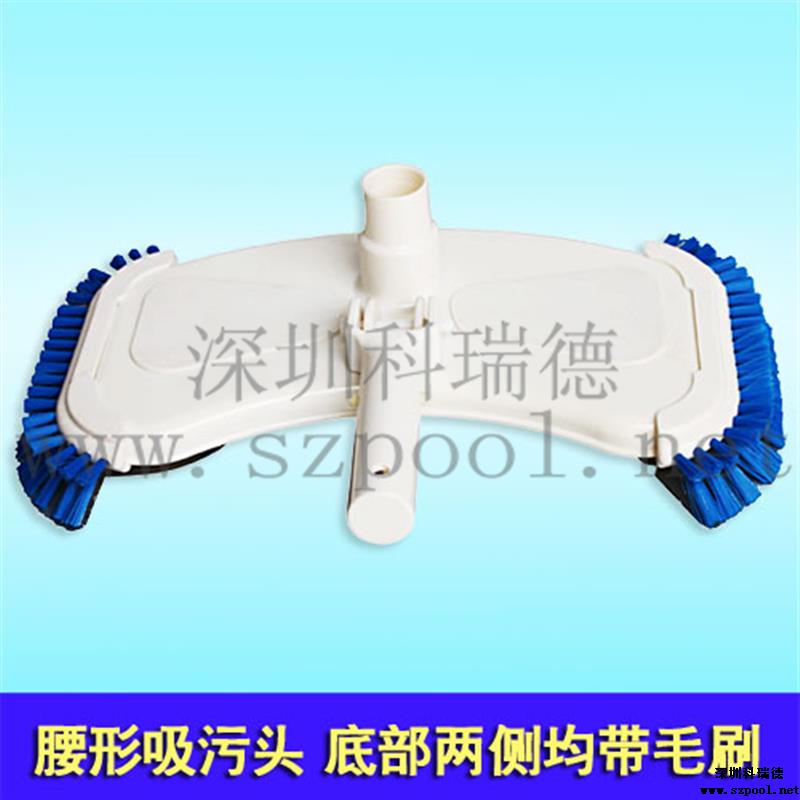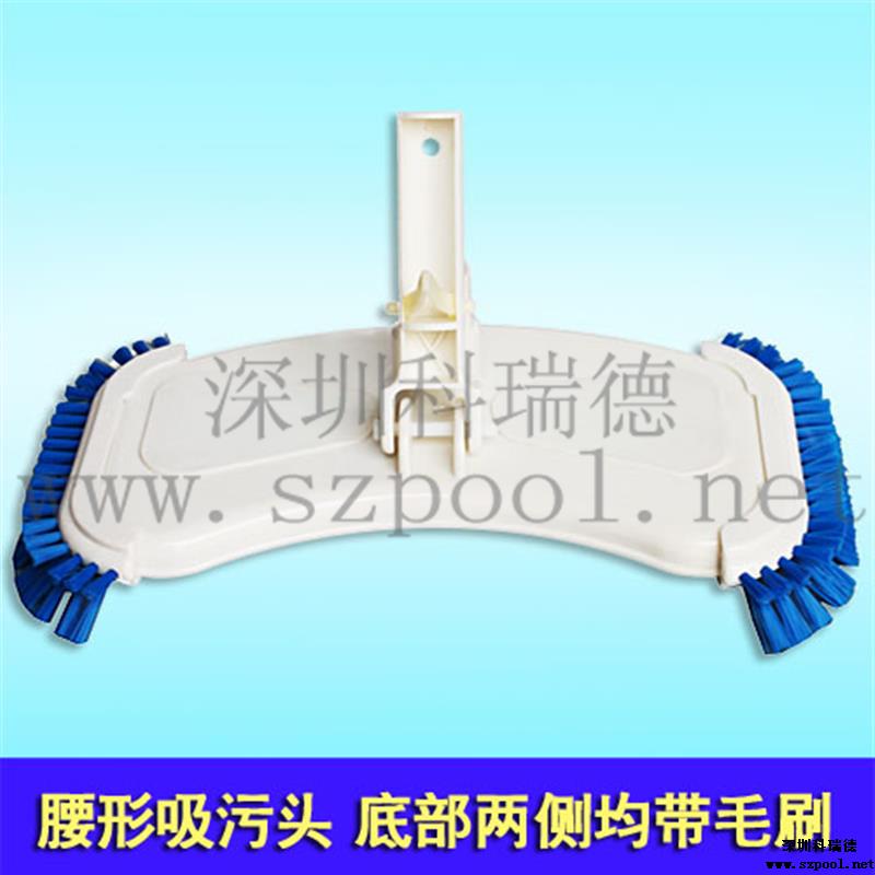 腰形吸污頭(6088BU)是游泳池吸污機的主要部件之一,吸污頭在吸污泵的帶動下,將泳池里的臟東西吸起,然后通過與之連接的吸污管傳到過濾處過濾。本吸污頭為腰形吸污頭,帶有底部及側(cè)毛刷。人性化設(shè)計,吸污干凈,操作簡單。用于與手動吸污機連接使用。