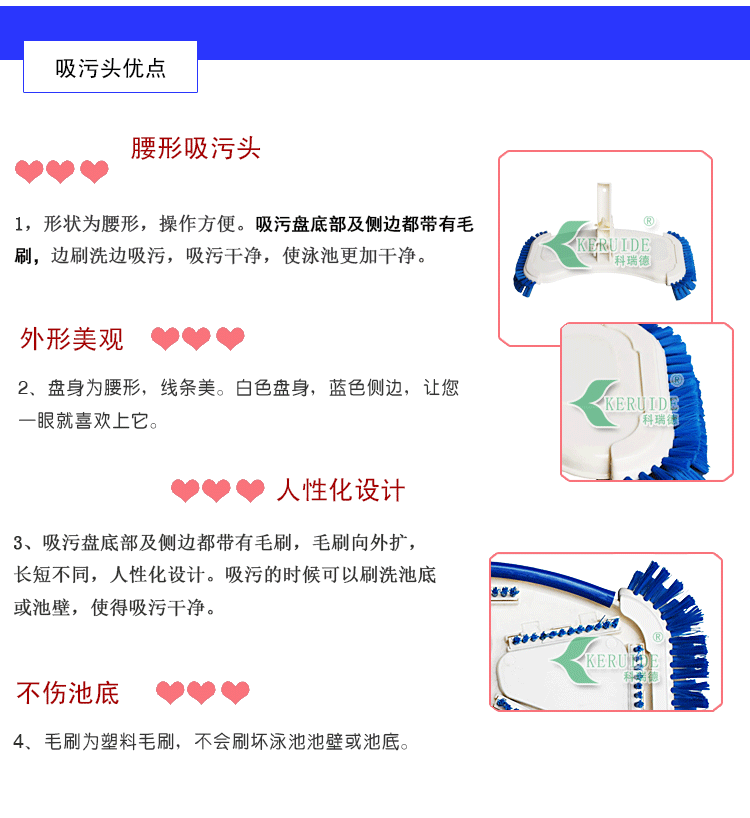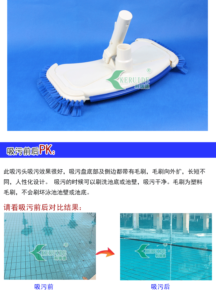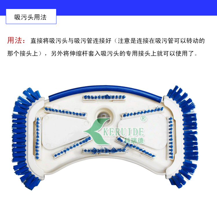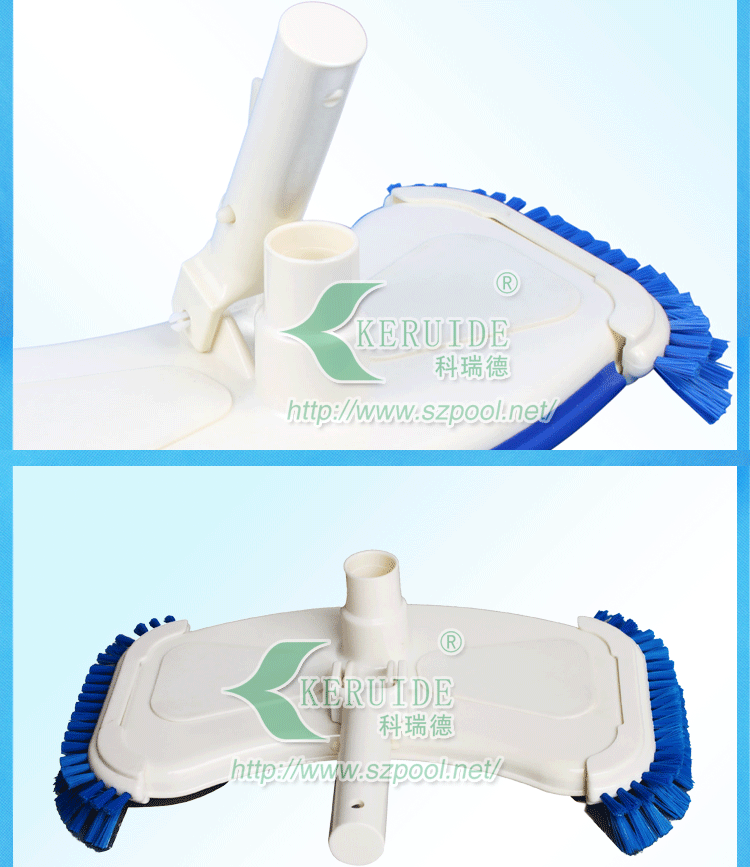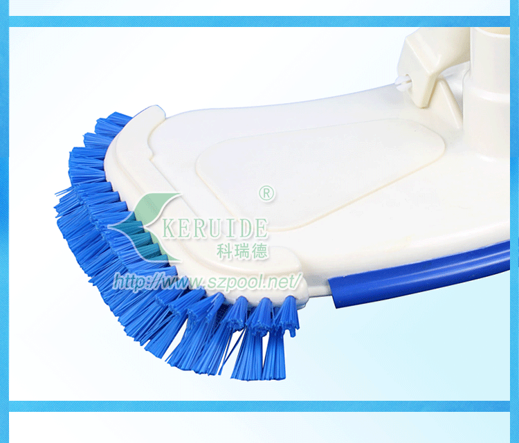 2、好的產(chǎn)品,除了美觀之外,還要使用,該吸污頭帶有的毛刷設(shè)計,它向外側(cè)展開,同時根據(jù)需求,毛刷長短不一,適合刷池底與池壁相接處難以清理的部位(這是很多泳池工作者頭疼的地方,因為普通的吸污頭吸不到那里)。