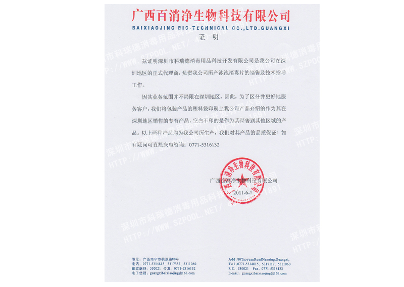 百消凈消毒片深圳地區(qū)代理商證明 |
