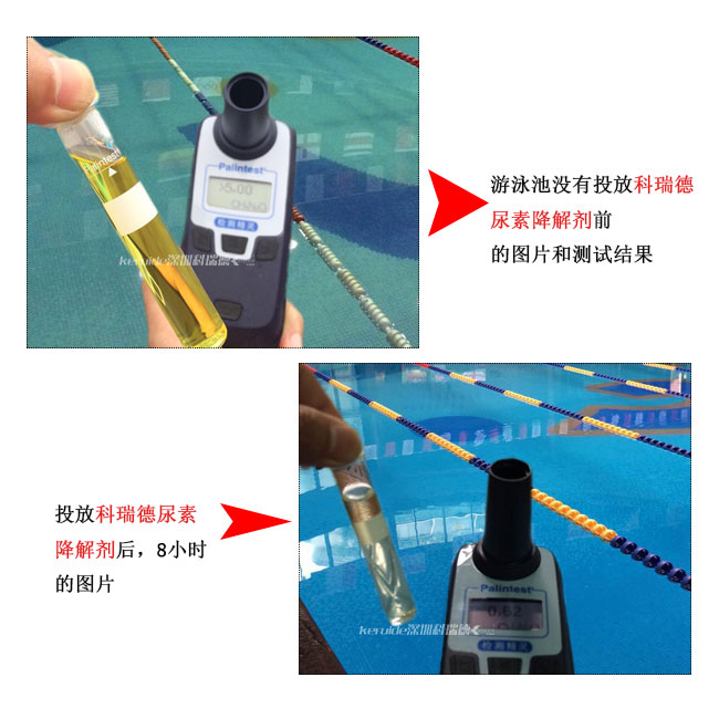 當我們用尿素測試條測出游泳池尿素超標的時候,我們可以用科瑞德尿素降解劑,這是一種無需換水去除尿素的方法,一般6-8小時可清除池水中的尿素!