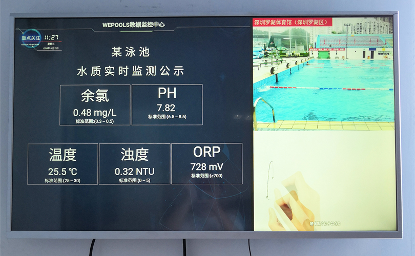 這是某泳池安裝了衛(wèi)普士五參數(shù)在線監(jiān)測(cè)儀的顯示效果,直接在公示屏登入賬號(hào)和密碼,打開界面如左上圖,五個(gè)參數(shù)實(shí)時(shí)動(dòng)態(tài)都會(huì)展示出來(lái),泳客們可以觀看一目了然。