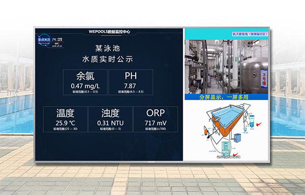 衛(wèi)普士水質(zhì)實(shí)時(shí)公示屏可顯示水質(zhì)的余氯、pH、溫度、ORP、濁度指標(biāo),并且可以一屏多用,展現(xiàn)游泳場館的游泳設(shè)施等。