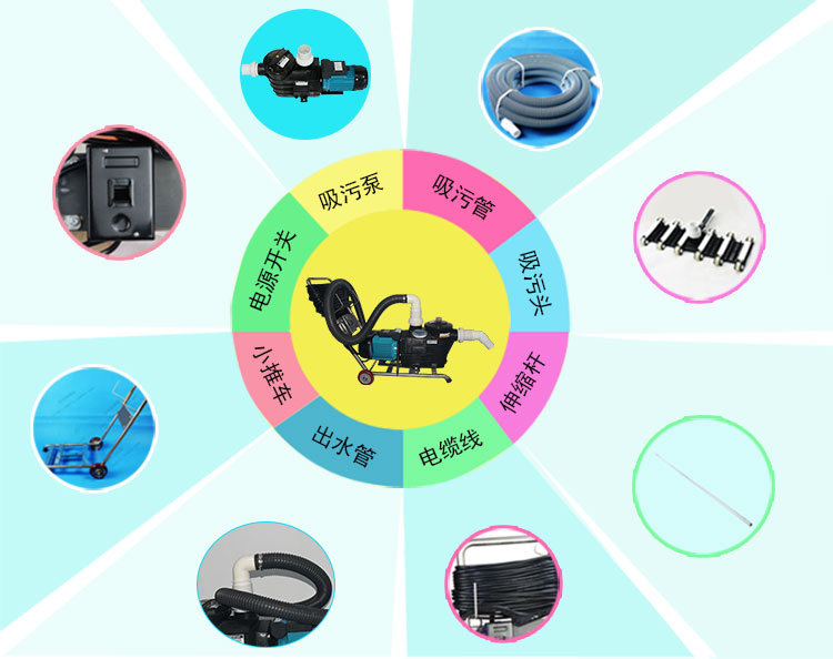 | 1.吸污泵; 2.不銹鋼推車; 3.泵體固定拉線; 4.開關(guān); 5.電纜線; 6.出水接頭; 7.排污出水管; 8.透明蓋; 9.進(jìn)水接頭; 10.進(jìn)水鋼絲管; 11.吸污盤(不銹鋼); 12.吸盤拉繩穿孔; 13.透明蓋開關(guān)扳手; | ||