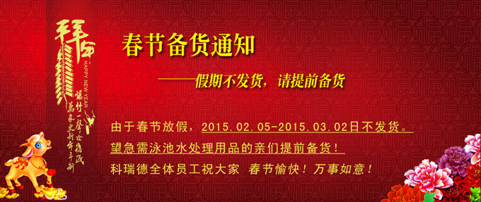 由于春節(jié)期間要放假,公司將于2015-02-05至2015-03-02日不發(fā)貨。望春節(jié)期間仍然開放的泳池,以及急需泳池水處理用品的親們提前備貨!春節(jié)期間接單不發(fā)貨,于節(jié)后3.2日起發(fā)貨。敬請大家相互轉(zhuǎn)告!