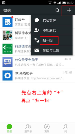 1,點(diǎn)擊右上角的“+”,然后點(diǎn)“掃一掃”;