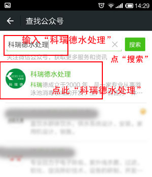 4,輸入后點(diǎn)“搜索”,然后再出現(xiàn)的公眾號中選擇點(diǎn)擊“科瑞德水處理”;